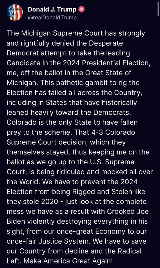 Pres. Trump releases a statement on the Michigan Supreme Court denying the effort remove Pres. Trump from the ballot: “This pathetic gambit to rig the Election has failed all across the Country.”