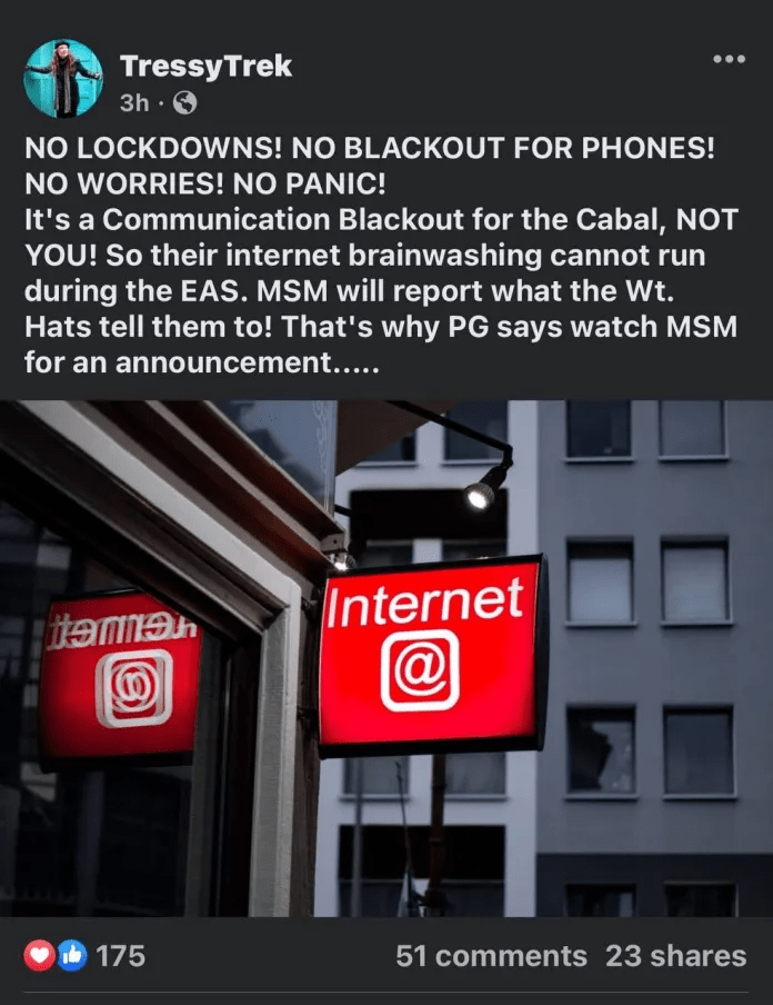 It’s a communication blackout for the Cabal, NOT YOU! So their internet brainwashing cannot run during the EAS. MSM will report what the White Hats tell them to! That’s why PG says watch MSM for an announcement.