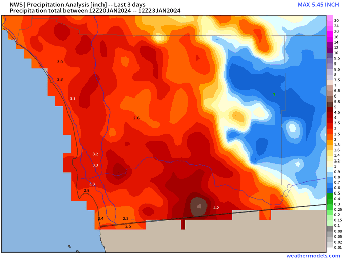 Rough calculation on San Diego county is 150-billion gallons of rainwater fell on the area, most of it in a short period of time resulting in flash flooding. Quick map of the past 72-hours. Quite unusual to be doing precipitation analysis for Southern California in January!… Show more