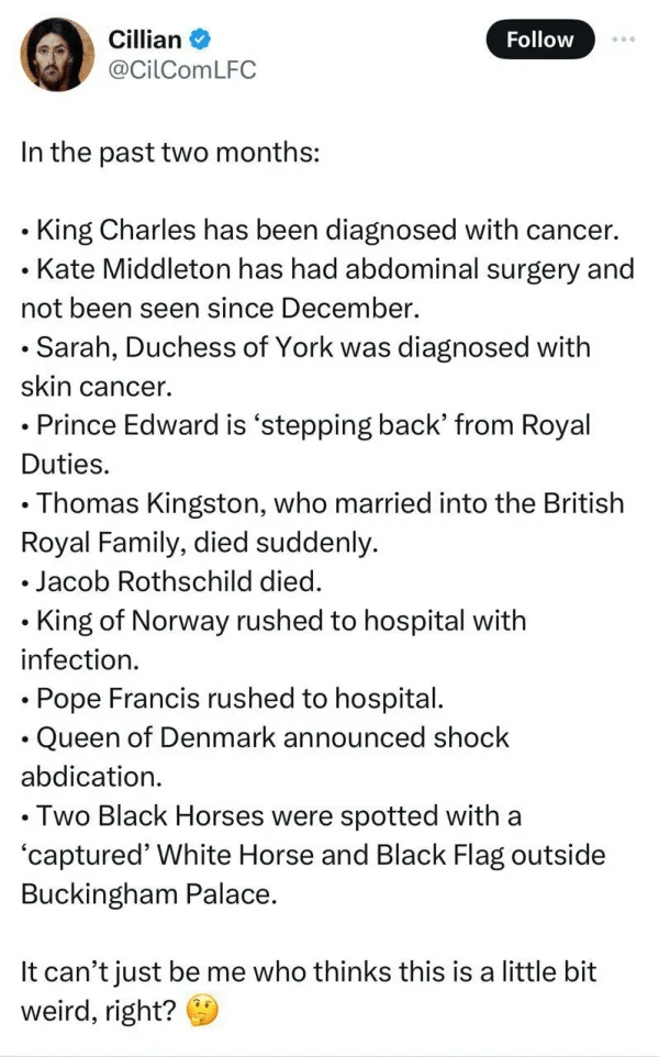 “The custom of royal riders is to never bring a white horse without the presence of the king and queen. The presence of a white horse means the presence of the king. When King Charles is not present in this Cavalry, it means that he is dead,” an MI6 source says.