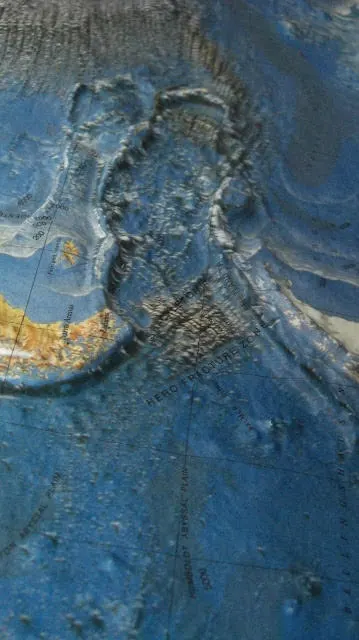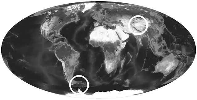 The second location north of Antarctica can be seen here on the topographic map. Here, too, from the direction of the approach, we see the imprint of a round celestial body of the same size, which has pushed land masses in front of it.