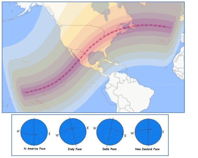 The day before the Eclipse there was a sense of anticipation from insiders, who knew that NIbiru could be revealed. The path of Totality covered a part of the Pacific and Mexico and then along the New Madrid Fault Line to the Seaway Exit. During this time the Daily Earth Wobble completes the Lean to the West and the Bounce Back. Thus the time when a photo is taken or the perspective of the viewer determines where Nibiru might emerge. This can also be seen in the direction the Moon takes when occulting the Sun.