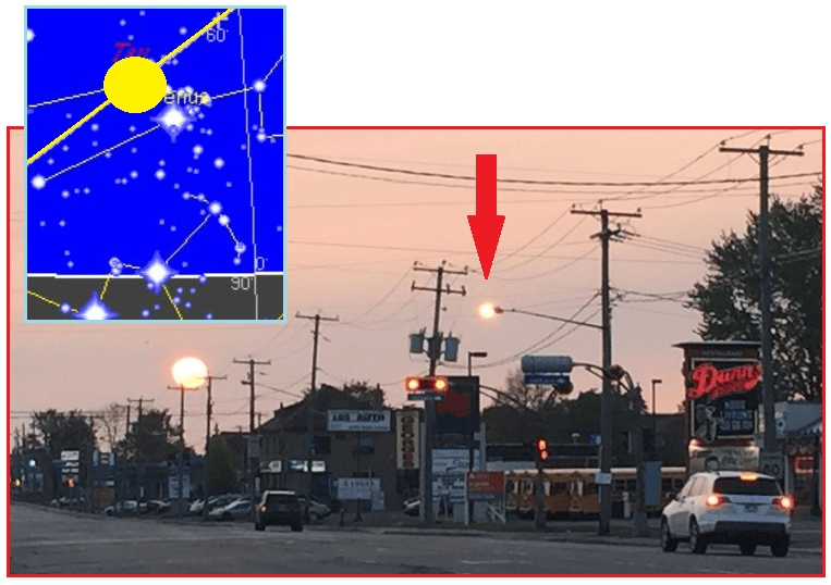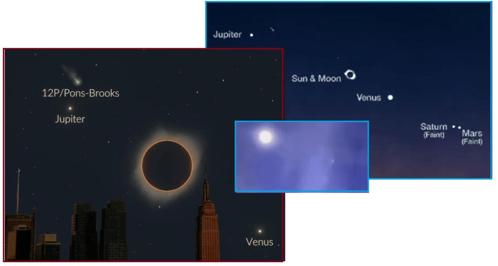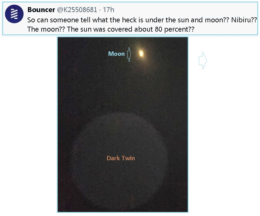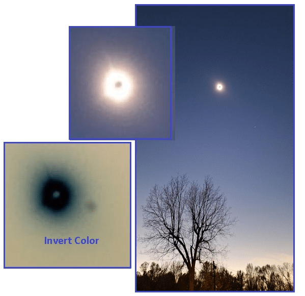 But Venus made an appearance during the Eclipse, becoming somewhat more visible when the Sun’s glare is reduced, as did the Dark Twin when the camera is pointing West.