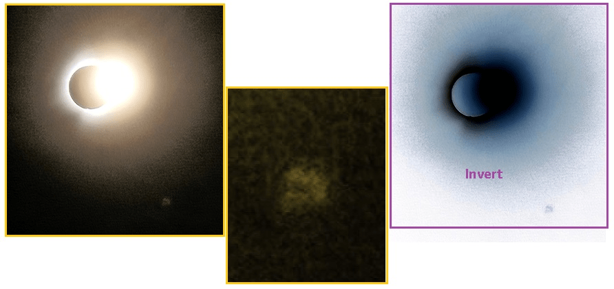 The location of Nibiru can also be determined by the appearance of a large mass during the eclipse, as the dust cloud is vast. A TicTock video confirms this vast dust shrouded mass off the 4 o’clock position is Nibiru. An excellent private photo from Tennessee shows upon inverse color a large shrouded object the expected size of Nibiru at the 4 o’clock position! This big fuzz ball is at quite a distance from the Sun, not tucked into the Corona, so is likely overlooked as the location of Nibiru.