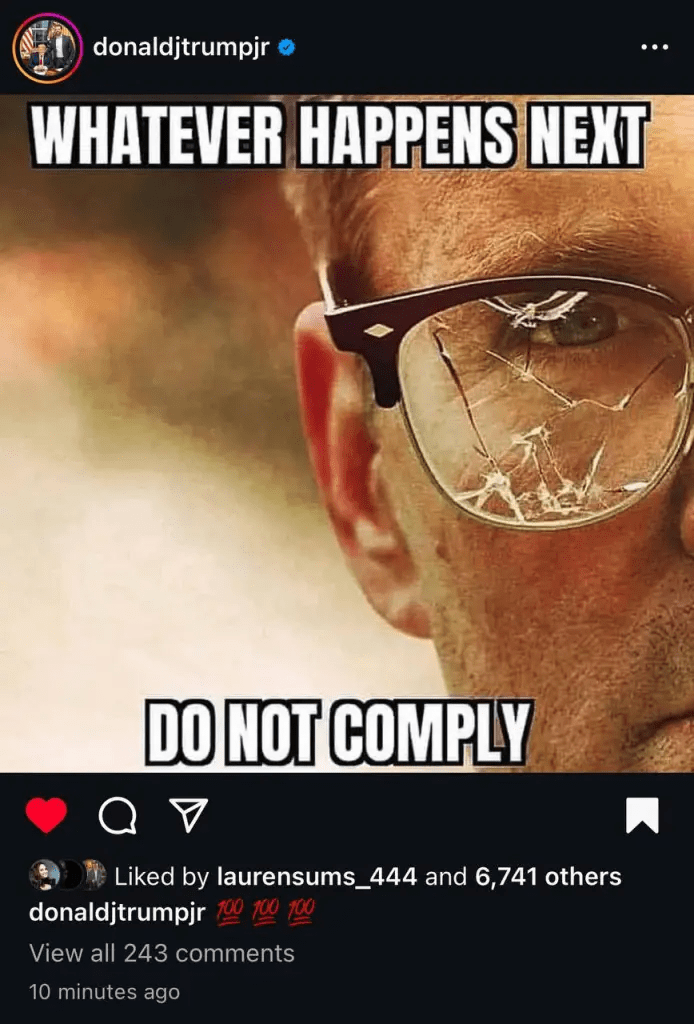 Don Jr. had a message for us yesterday. His Instagram post said, no matter what happens, DO NOT COMPLY.