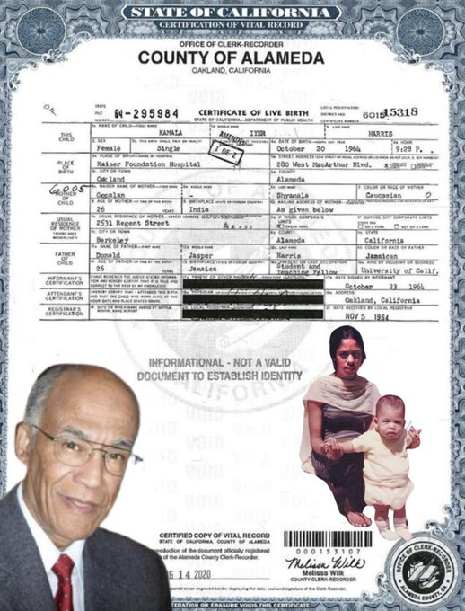 HERE IS A PICTURE OF KAMALA IYER HARRIS’S BIRTH CERTIFICATE Her mom was born in India Her dad was born in Jamaica They met through mutual activism at the socialist University of California Berkeley… SHE IS AN ANCHOR BABY WITH TWO HARDCORE EXTREME-LEFT POLITICAL ACTIVIST… Show more