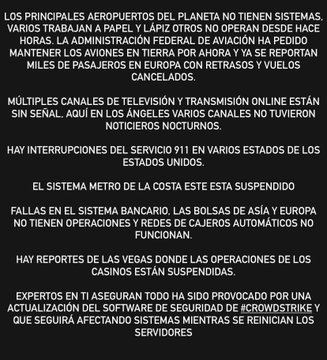 Airports without flights, screens without service, banks without transfers, trains without departures, immigration checkpoints closed, all due to the worldwide failure of Microsoft Windows #Crowdstrike . We are in one of the largest cyber blackouts in history. #ULTIMAHORA