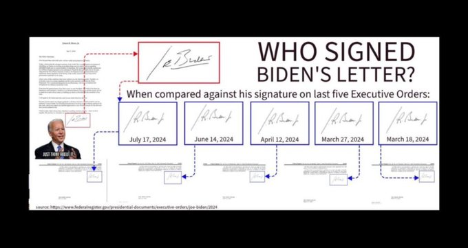 At first I didn’t think much of this but upon further review, HOLY SH*T. This was a legit coup today. It’s not his signature. This is a blatant criminal forgery and a coup. Why no word from Biden himself? In the fog of the assassination attempt, the Democrats initiated a coup.
