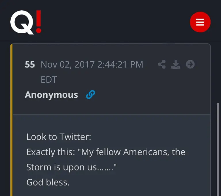 It sounds like he also said the next 3 weeks would be dangerous. See this Telegram. Three weeks is 21 days, and that references Q drop #2903. “It’s going to be HISTORIC! Planned long ago. Within the next 21 days, BIG, BIG HAPPENINGS are going to take place. ~ Q”