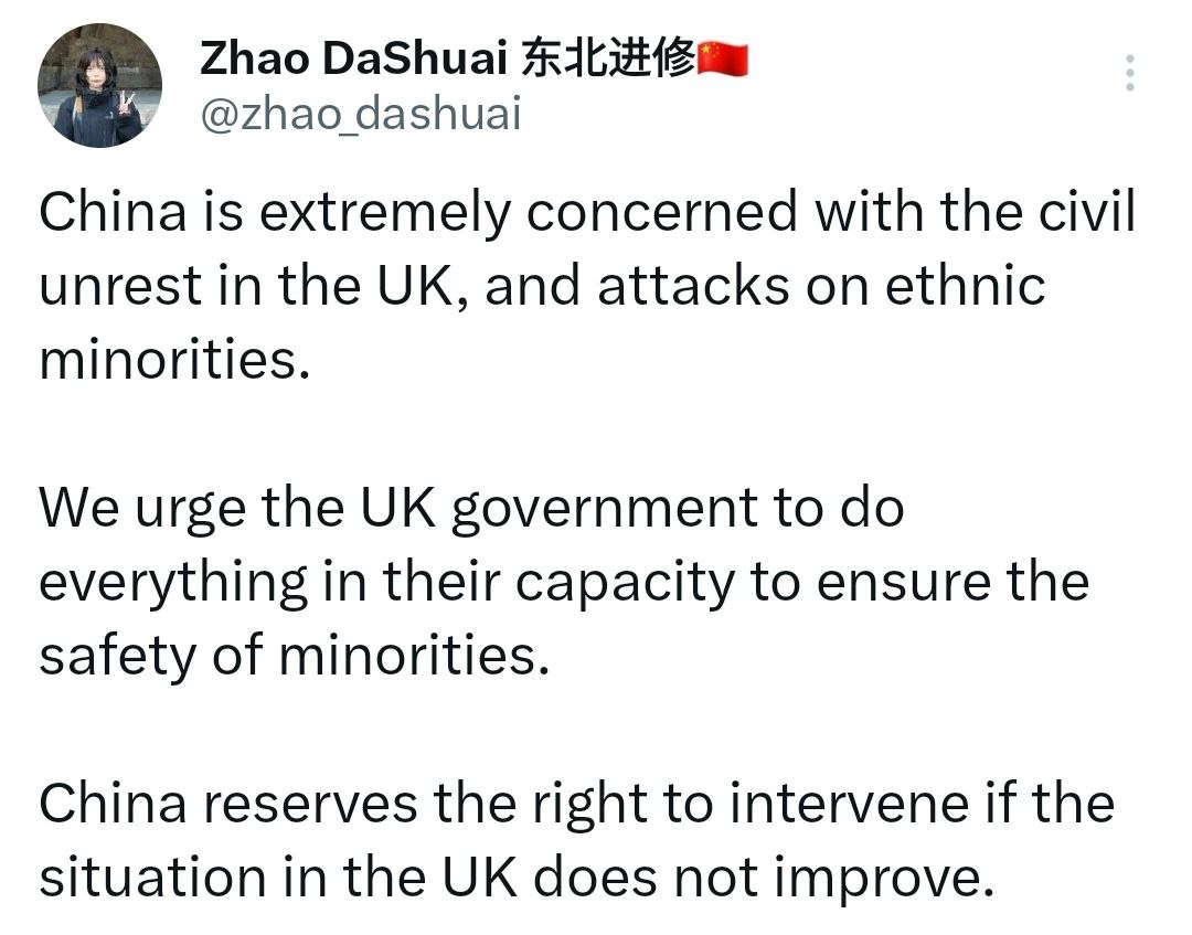 “China is extremely concerned with the civil unrest in the UK, and attacks on ethnic minorities.