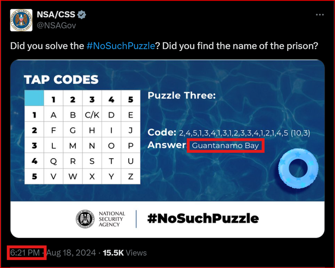 Great catch @WarHorizon NSA/CSS’s X post with the answer of “Guantanamo Bay” has a timestamp of 6:21 PM EST This is confirmation of an X post Ezra Cohen put out yesterday with the same timestamp of 6:21 PM EST Here’s the decode: Ezra Cohen giving us a little insight to what… Show more