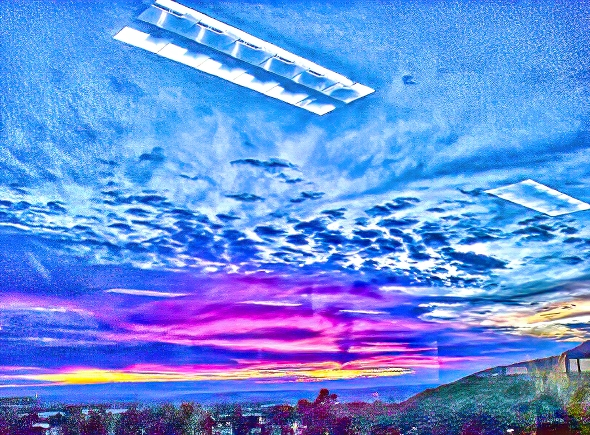 Another example of Radionnic Ships and Pleiadian Ships working together, this time involving a Radionnic Field is seen in Fig. 16 below. The photo was taken in Brantford, Ontario, on the 17th of April, 2019. The Radionnic side is a Radionnic Father Ship Field sitting off in the distance over the Motel roof at the right. P’s in a pod comprise the Pleiadian side in a very large Father Ship pod sitting much closer in at the left. Another type of lengthwise Pleiadian cloud reflection, looking for all the world like a Pontiac automobile grill sits just to the right of the pod. Two more partially formed Pontiac Grills sit just to the upper right of it.