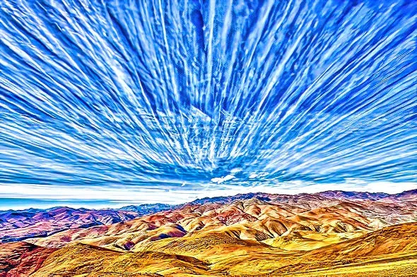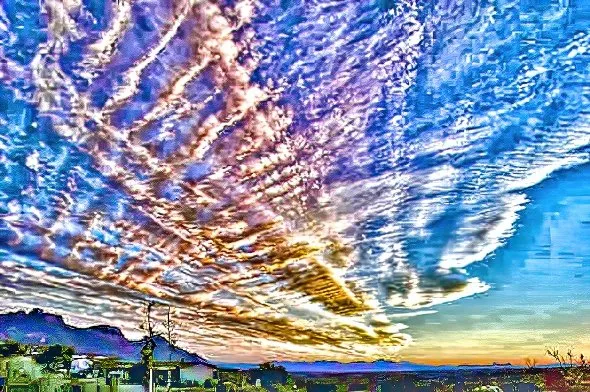 Photo Fig. 19 below from Can Stock has a Mother Ship hand ghosting away in the upper right quadrant. Plus two small pods are sitting in the clump of cloud at the lower right. Plus it has a long Pleiadian Ship slanting upwards left near the bottom left, plus a Radionnic field up the middle which is impossible to miss, plus a nice little saucer shaped Radionnic Ship sitting just above the hills at center left, and also a clutch of spherical Radionnic Scout Ships just to the right of the saucer. Also, like in Fig. 16 above, small Radionnic Scout Ships abound in the clouds up the left side of the Radionnic Field plus also to the right of the middle. You have to admit there’s more than just a few of these things hanging around out there, this is just small one photograph in one small area of sky.