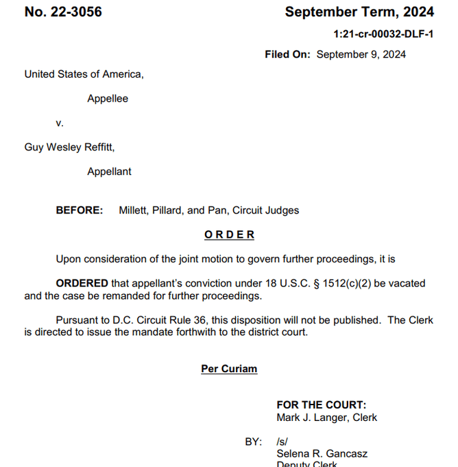 WOW: Yesterday the DC appellate court vacated the 1512(c)(2) convictions of 11 J6 defendants including Guy Reffitt, the first J6ers convicted at trial. What a total humiliation of the DOJ and 17 DC judges (including Pan) who allowed this wrongful prosecution to happen in the 1st… Show more