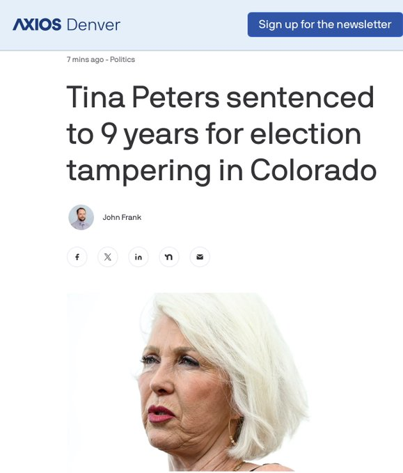 BREAKING: Tina Peters, a prominent election denier and Trump supporter, was sentenced Thursday to 8 ½ years in prison and six months in jail for election tampering after prosecutors and witnesses blamed her for fueling a national movement to undermine trust in U.S. elections.… Show more