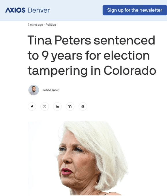 This news below is an appalling miscarriage of justice. Will it incite people to vote? Will they care that truth and lawfulness are trampled in the courts to take down political adversaries and make an example of them? Do they realize that if these corrupt thugs can do it to Tina Peters, they can do it anyone? They’ve been doing it for decades. Now we are seeing it under the microscope. Do we want to live in a world where those who do what is right, and do the right thing for the right reasons are imprisoned?