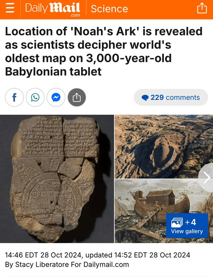 Location of ‘Noah’s Ark’ is revealed as scientists decipher world’s oldest map on 3,000-year-old Babylonian tablet Read: https://dailymail.co.uk/sciencetech/article-14011293/Noahs-Ark-revealed-worlds-oldest-map-Babylonian-tablet.html?ns_mchannel=rss&ns_campaign=1490&ito=1490