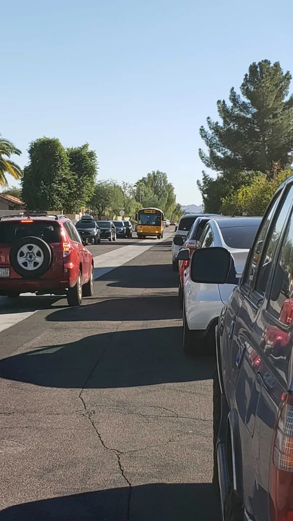 This is the street [below] with parents lined up on both sides to pick up their kids and a school bus taking up the rest of the road. There is also a set of mailboxes next to his home where the USPS and residents stop their cars to get their mail.
