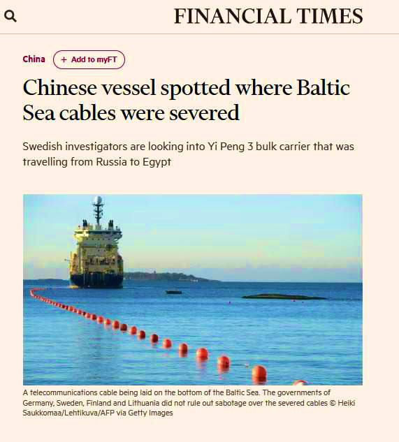BREAKING UPDATE WWIII WATCH Investigators of two severed data cables in the Baltic Sea are looking at the movements of a Chinese bulk carrier, the second such probe in recent months amid rising jitters in Europe over potential acts of sabotage. Yi Peng 3, a… Show more
