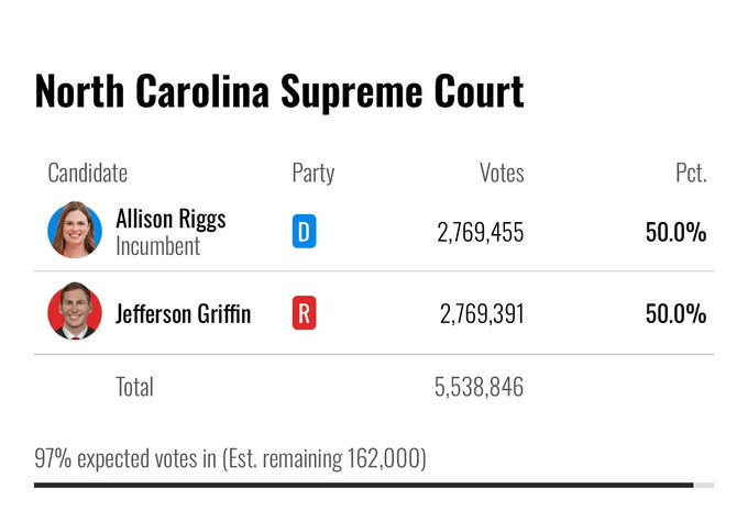 BREAKING: Now that ballots have continued to be counted, the Democrat has taken the lead in the North Carolina Supreme Court election. The Republican had been leading.