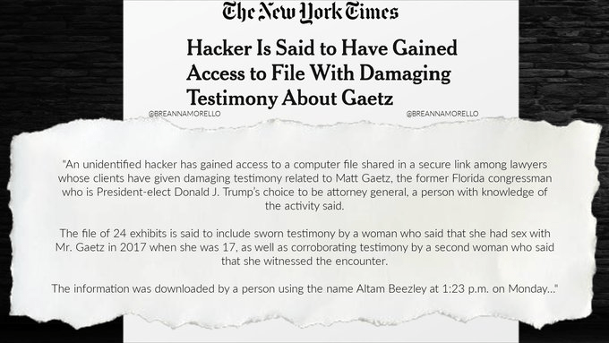 BREAKING The New York Times is claiming a hacker has gained access to a file with “damaging testimony” about Trump’s AG pick Matt Gaetz. The NYT is historically known for running pieces fed to them by the intel community. Understand that before reading…