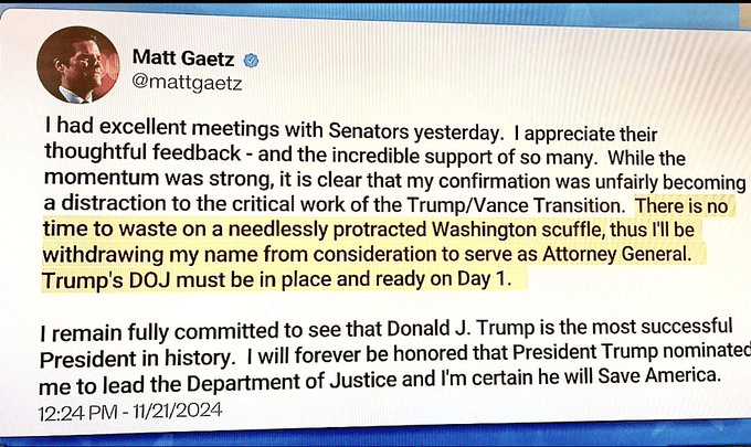 Obviously there’s a plan with the players filling the roles in the Trump administration. They put it out there that Kash Patel is the top pick for FBI Director yet they are sitting on that. They are gaming the system and keeping the dark on the edge of their seats. They have no clue what’s coming and I wouldn’t be surprised if the next candidate will be even worse for them than Gaetz. Out of the frying pan, into the fire.