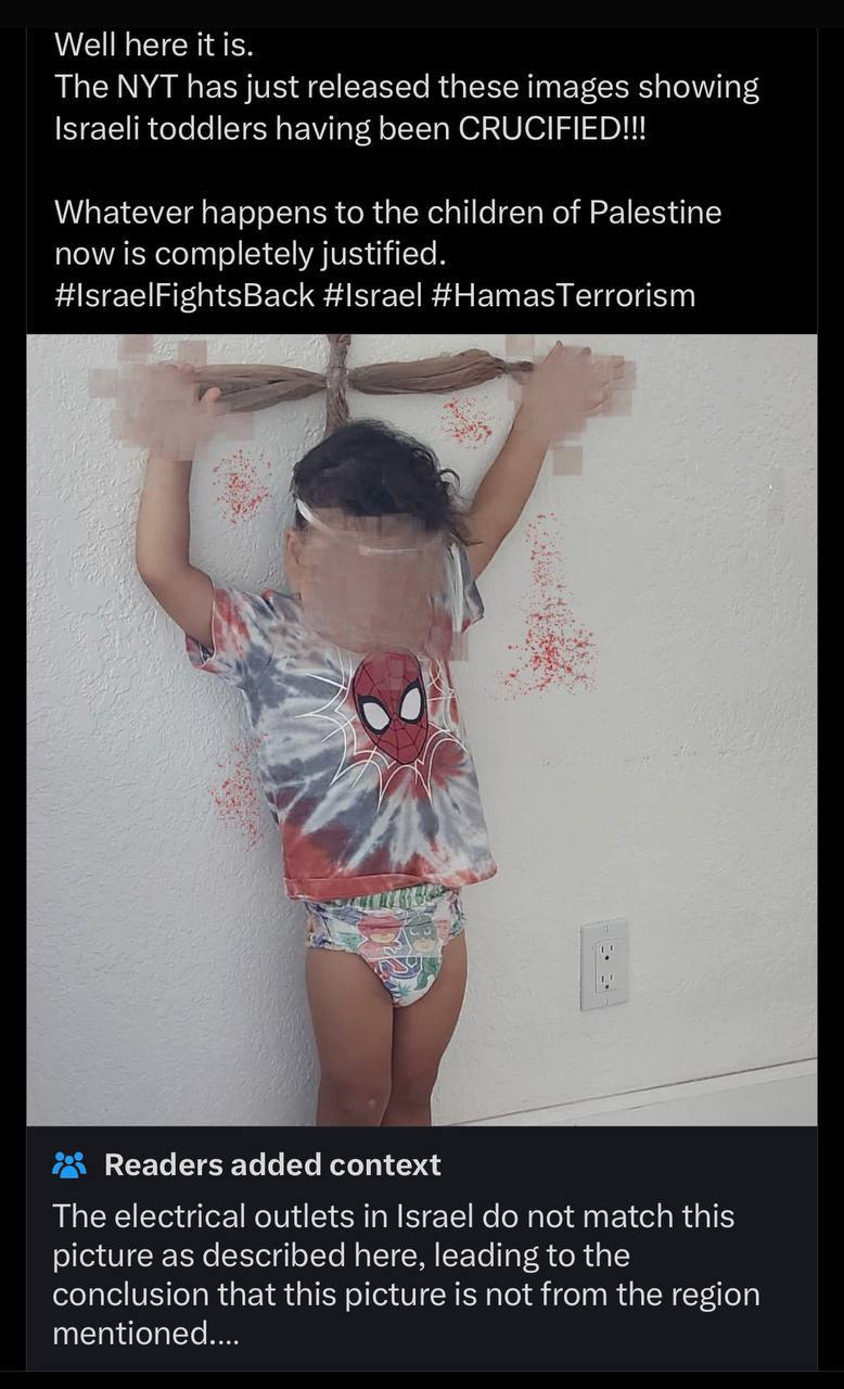 The Corporate propaganda media has also lost all restraint. The New York Times posted a photo of a “crucified child” to justify killing Palestinian children! This was instantly debunked: Look at the American/Canadian electrical outlet in the image.