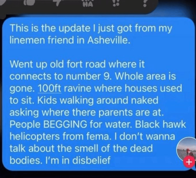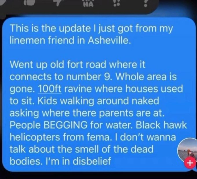We just received this update. Absolutely sickening what is happening and the government response is simply disgustingly mind numbing. America can do better than this. This is what happens when we have a false leader and an even weaker VP. The consequences of a HURRICANE in the Mountains of North Carolina are biblical and we now have to figure out how to help these Americans. Please let me know where aid can be sent. And our military must get heavily involved to assist the humanitarian operations and NOW!