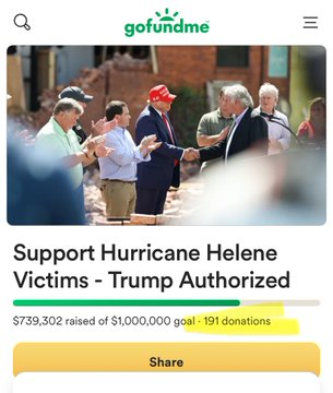 Trump took Matters into his own Hands and Launched a GoFundMe to Help Support those Affected by Hurricane Helene It’s already at almost $1 Million after several minutes… Incredible! Top Donors • Senator Kelly Loeffler $500k • Dan Newlin $100k • Bass Pro shops $100k • Kid… Show more